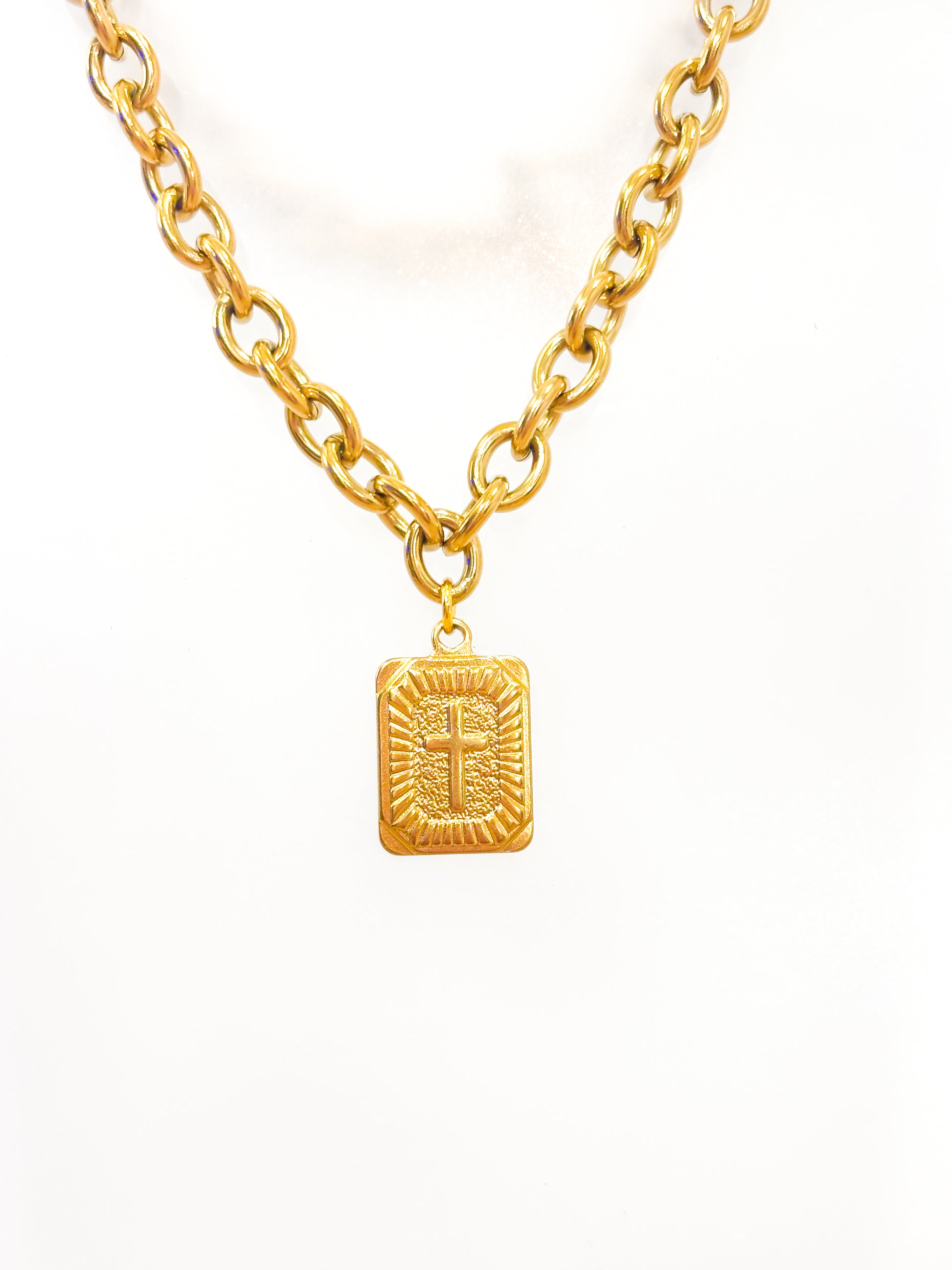 - This statement necklace pairs a chunky gold link chain with a detailed cross medallion, glowing with sunburst rays.