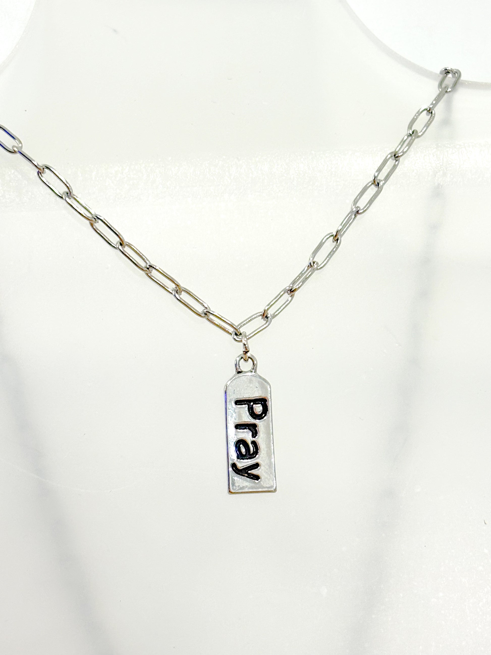 A minimalist silver chain with a bold “Pray” pendant — a daily reminder to keep faith at the center of your life.